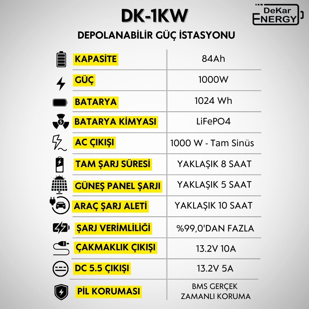 DK-1KW , 1000W kapasiteli depolanabilir güç istasyonudur. İçerisinde TAM SİNÜS İNVERTER bulunmaktadır. Tıbbi cihaz kullanımı gibi önemli işlevleri yerine getirir. Tam sinüs inverterler, motorlu cihazlar gibi hassas ekipmanlar için uygundur. (Kombi,220V Buzdolabı,Tıbbi cihaz vb.) Taşınabilir tasarımı ve yüksek güç kapasitesi sayesinde enerji ihtiyaçlarınızı hızlı ve verimli bir şekilde karşılar.